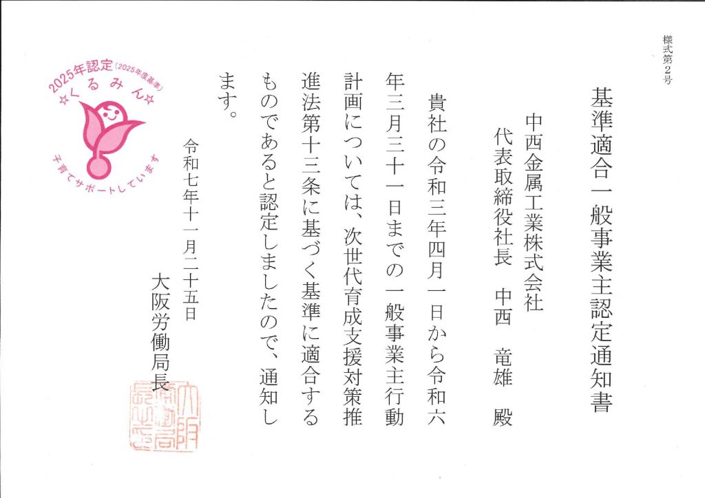 この度、「中西金属工業株式会社」が、大阪労働局長より2回目の「くるみん」認定を受けました!