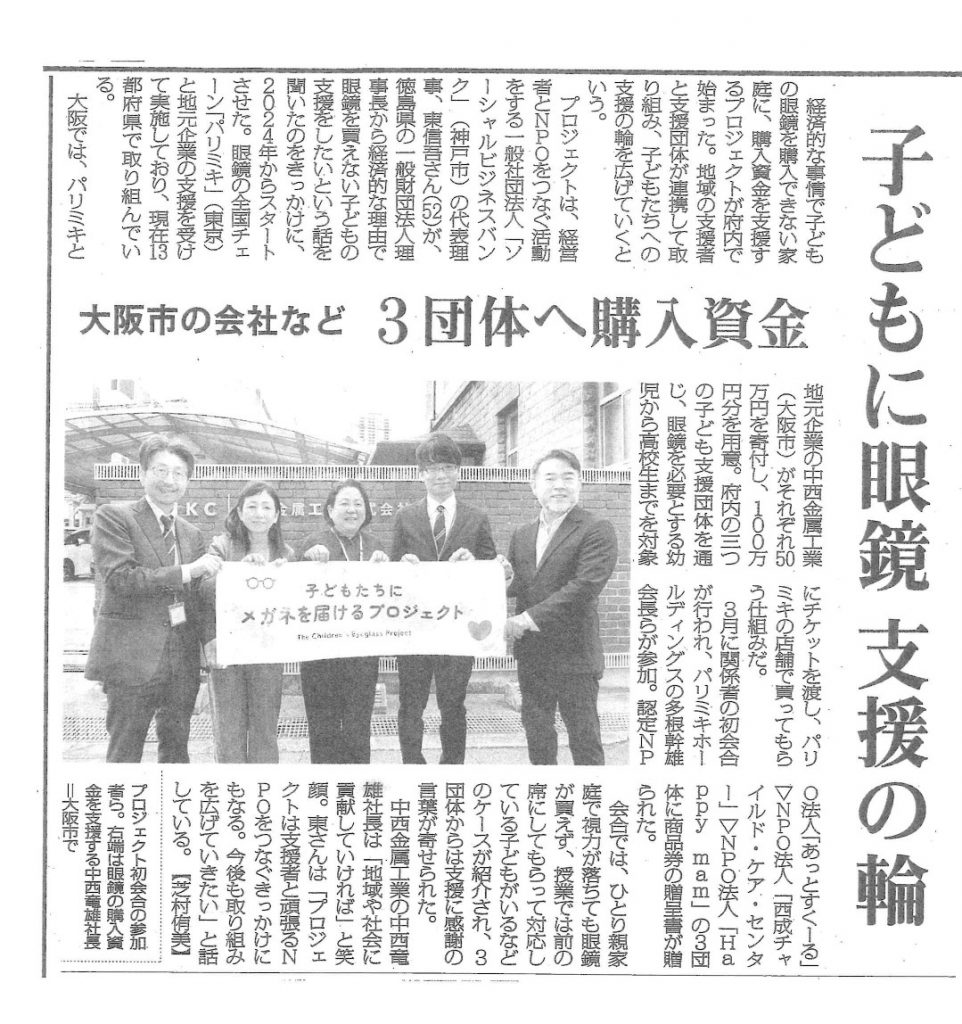 中西金属工業株式会社は、株式会社パリミキ、および地域の子ども支援団体(※)と協力し、大阪府内で経済的な理由等でメガネの購入や買い替えが困難な状況にある子どもたちを対象に、メガネを寄贈する支援プロジェクトを実施いたしました。本プロジェクトの大阪地域での実施は初めてとなります。